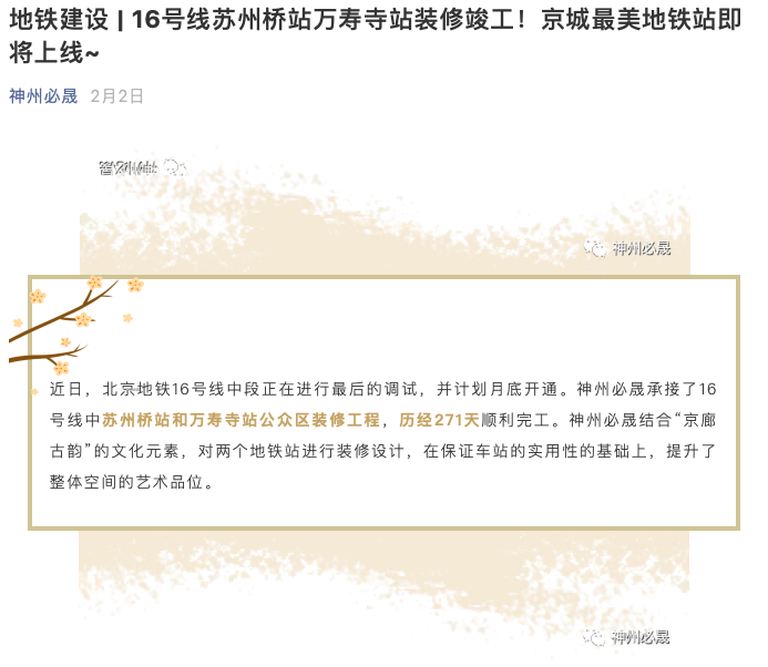地鐵建設 | 16號線蘇州橋站萬壽寺站裝修竣工! 時間 :2021-02-26 22:25點擊 :1845 上一篇:校園文化 | 書香墨韻環境,學生樂享校園生活 下一篇:神州必晟喜迎牛年!2020感恩相伴,2021再創佳績!