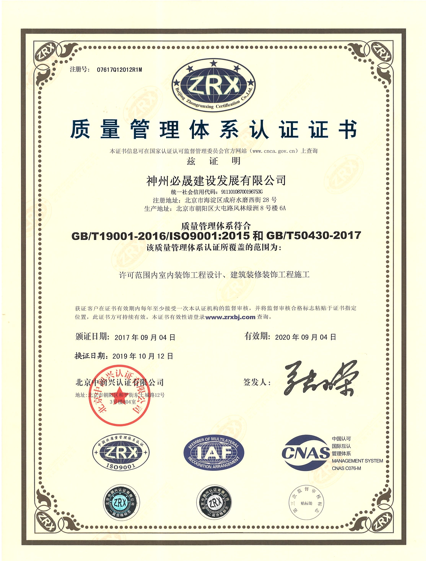 質(zhì)量體系證書